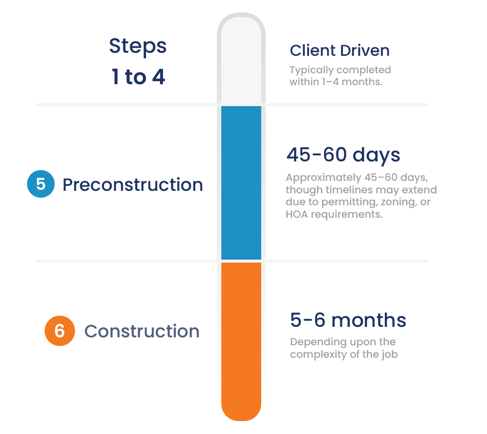 This phase includes permitting, HOA approvals (if applicable), design studio selections, and other pre-construction activities required to prepare for building.